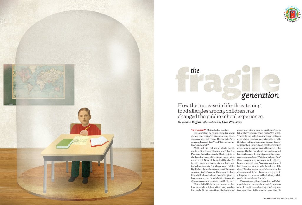 This special report in the September 2016 New Jersey Monthly Education issue traces the astronomic rise in life-threatening pediatric allergies and shows how it has changed the public school experience in New Jersey. It was later cited in “Climate Change and Human Health: A Review of Allergies, Autoimmunity and the Microbiome” (Ray & Ming, 2020) in the International Journal of Environmental Research and Public Health.